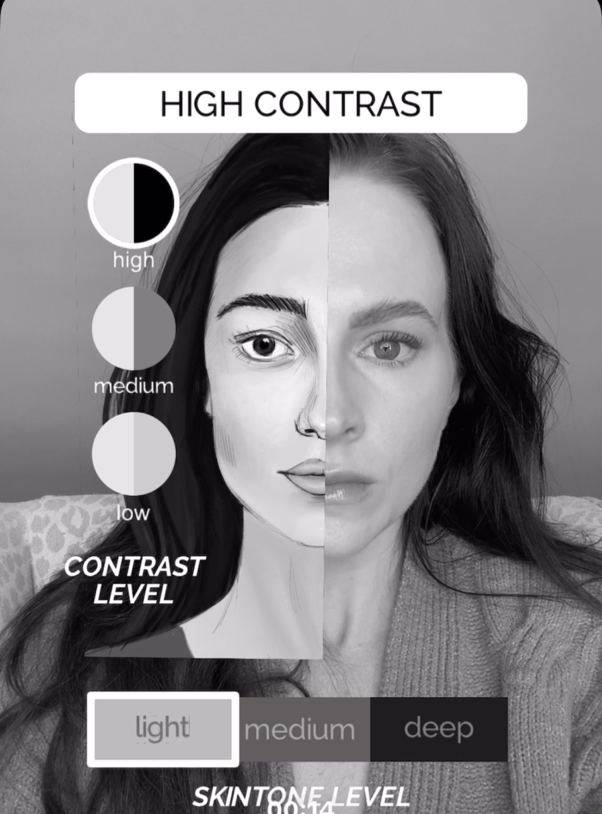 If you want to try the Tik Tok filter that uses AI to help you determine your contrast level, search ‘Contrast Filter’ in the search bar. If you don’t have Tik Tok, take a selfie with no makeup on in front of a window for the best lighting, then use your camera filter editor to change the image to black and white. This will give you a good reference point to experiment from.